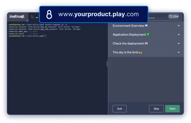 Your technology demo should be stood up and ready to go in minutes. Adding new features is as simple as copy and pasting. With Instruqt, you can show up to your meetings and be demo ready every time.